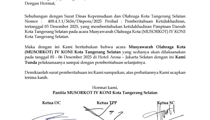detak.co.id, PONDOK AREN – Agenda Musyawarah Olahraga Kota IV (Musorkot ke-4) Komite Olahraga Nasional Indonesia (KONI) Kota Tangerang Selatan yang sudah dijadwalkan akan digelar pada Jum’at-Sabtu (05-06/12/2025), tiba-tiba dibatalkan dan diundur pelaksanaannya tanpa batas waktu. Hal tersebut tertuang dalam surat KONI Tangerang Selatan Nomor: 01-267/KONI-KTS/XII/2025 tentang Penundaan Pelaksanaan Musorkot IV KONI Kota Tangerang Selatan yang ditandatangani Ketua OC Haryadi, Ketua TPP Landung Mintohardjo, Ketua SC Henry Kristianto, dan diketahui oleh Ketua KONI Hamka Handaru.