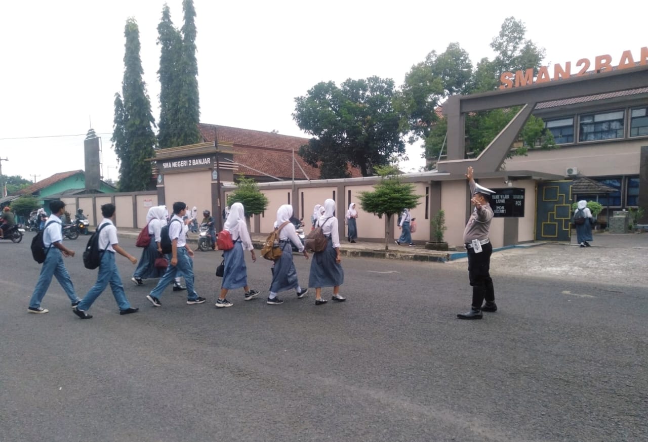 detak.co.id KOTA BANJAR-Senin (13/10/2025) pagi, personel Unit Lalu Lintas Polsek Langensari Polres Banjar melaksanakan kegiatan Gatur Pagi di depan SMAN 2 Banjar dan Simpang Empat Pasar Langensari. Kegiatan ini merupakan bagian dari program peningkatan interaksi Polri dengan masyarakat di area publik, sekaligus upaya menciptakan kelancaran arus lalu lintas dan keselamatan pengguna jalan.