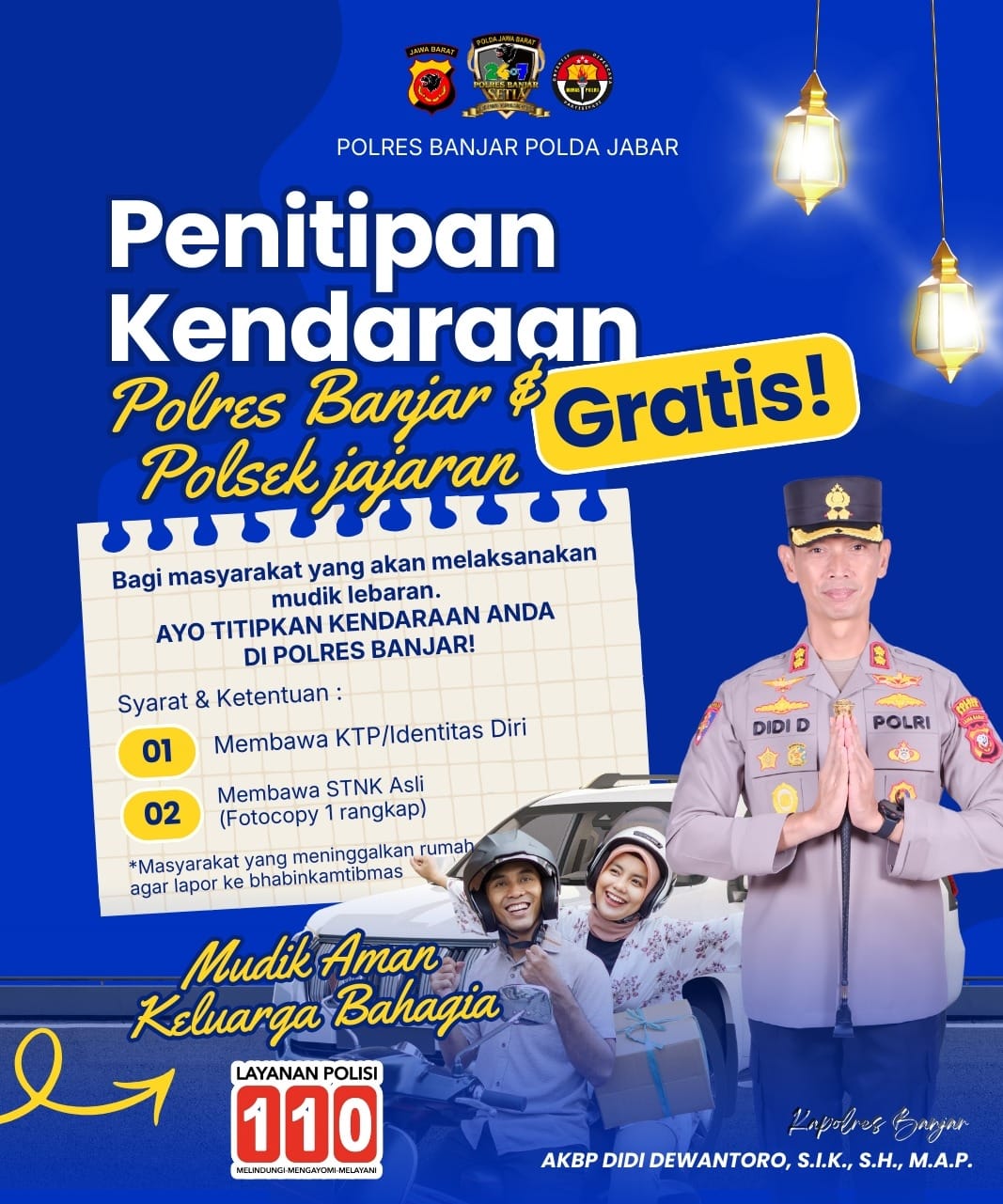“Polres Banjar membuka layanan penitipan kendaraan bagi masyarakat yang akan melaksanakan mudik Hari Raya Idulfitri 1447 H. Kendaraan roda dua maupun roda empat dapat dititipkan di Mako Polres Banjar agar masyarakat merasa lebih tenang saat meninggalkan rumah,” ujar Kapolres Banjar.
