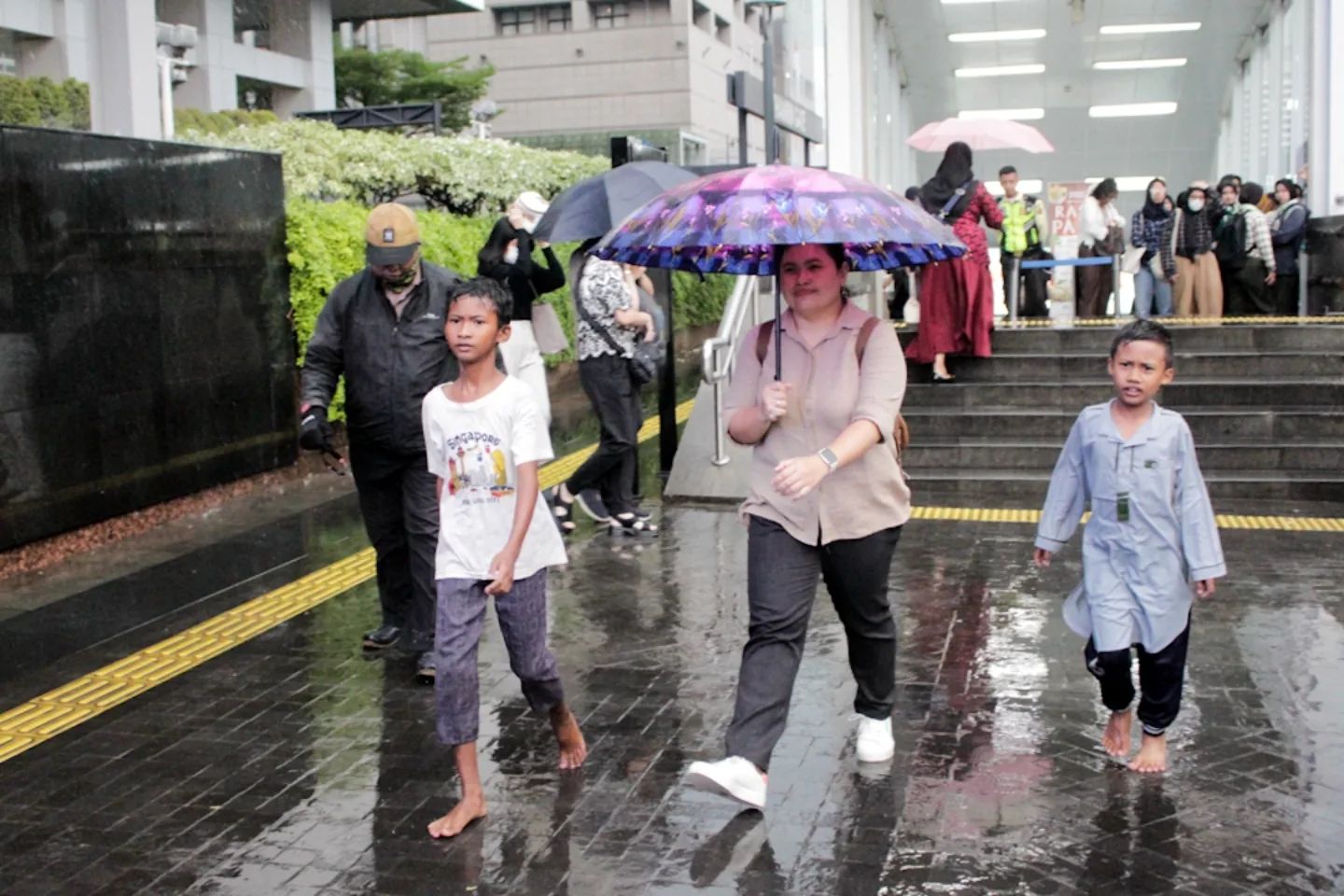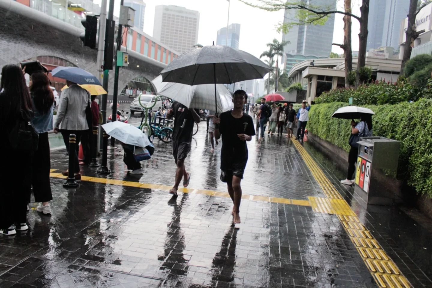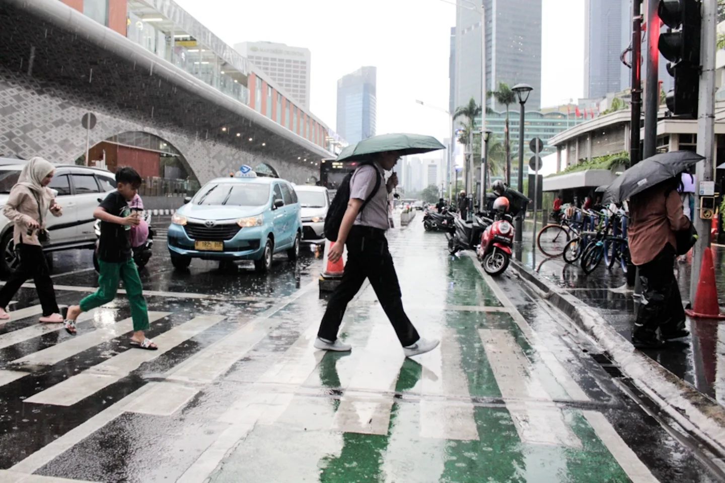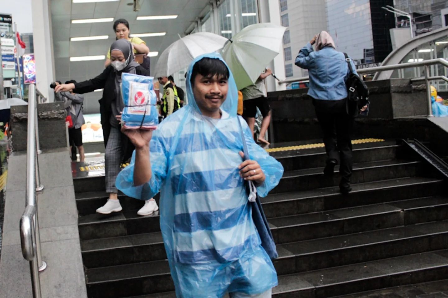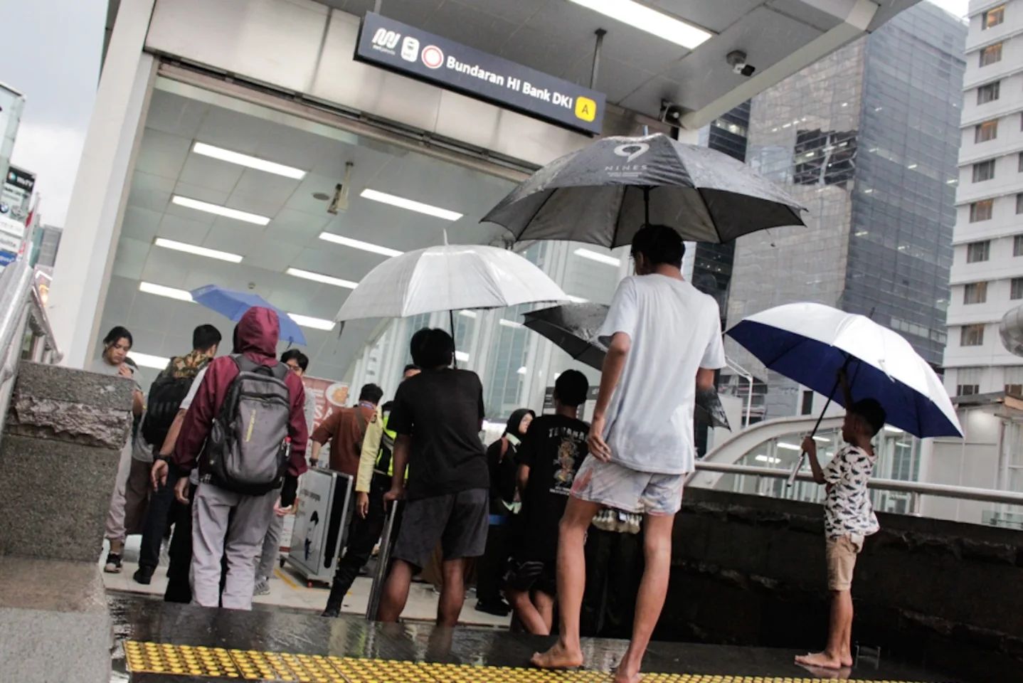 JAKARTA, detak.co.id – Sejumlah ojek payung menawarkan jasa penyewaan payung bagi pejalan kaki di kawasan Stasiun MRT Bundaran HI, Jakarta, Selasa (5/11/2024). Masuknya musim hujan pada bulan November dimanfaatkan sejumlah warga untuk mengais rezeki dengan membuka jasa sewa payung. (DETAK/Aip Kurniawan)