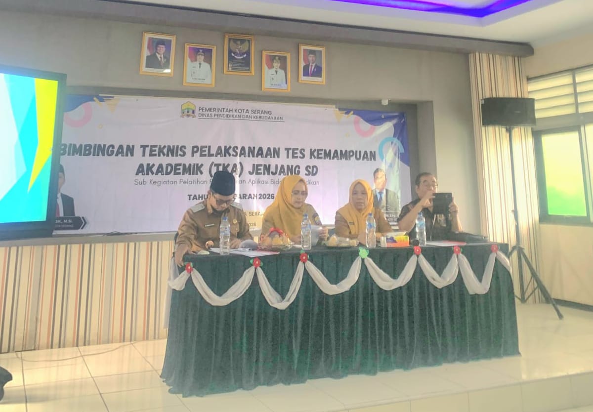 detak.co.id Kota Serang menjadi daerah pertama di Provinsi Banten yang menggelar Bimbingan Teknis (Bimtek) Pelaksanaan Tes Kemampuan Akademik (TKA) jenjang Sekolah Dasar (SD).