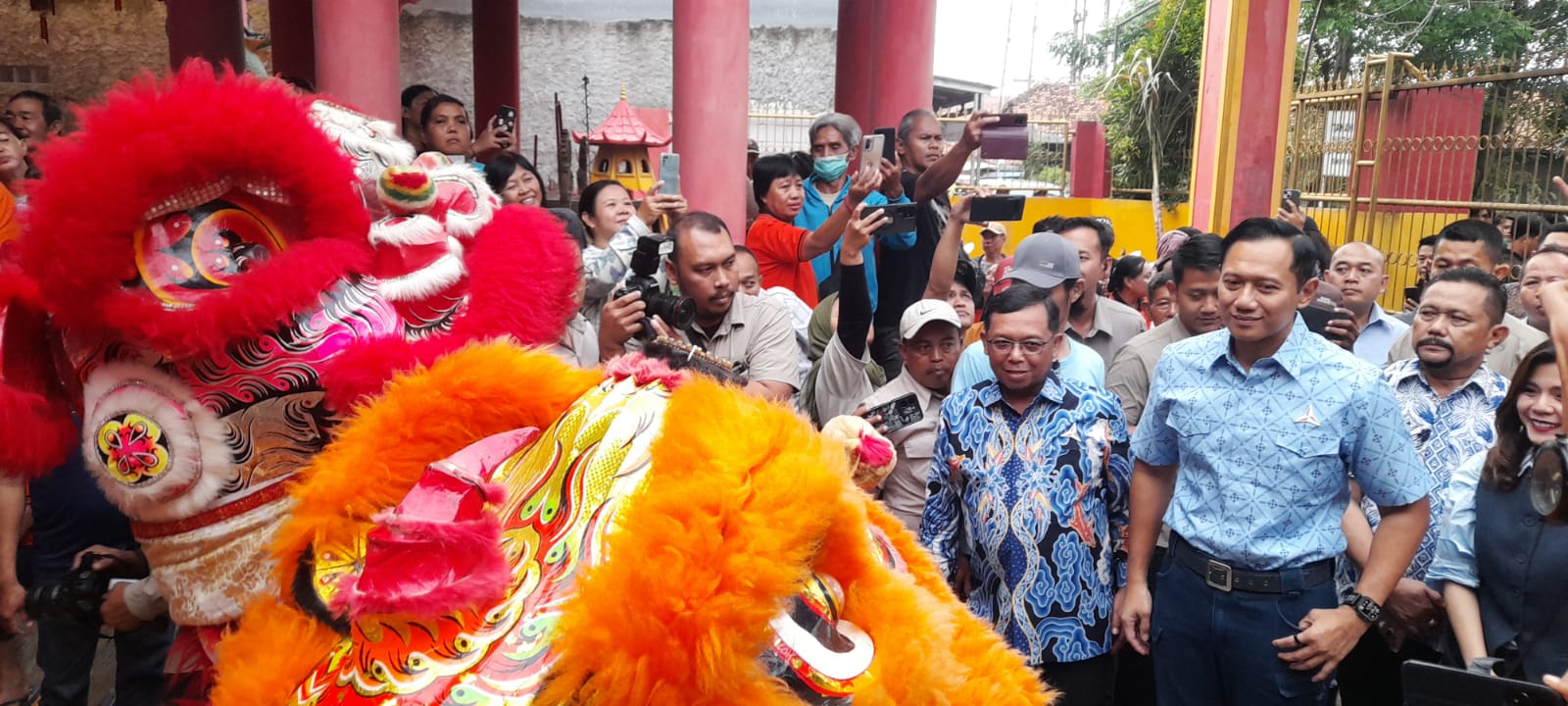 Kedatangan AHY disambut oleh pengurus vihara dan masyarakat, serta diiringi penampilan kesenian tradisional Barongsai.