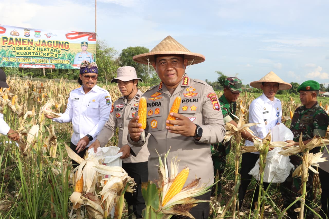 detak.co.id TANGERANG – Kapolresta Tangerang Kombes Pol Andi Muhammad Indra Waspada Amirullah kembali melaksanakannya kegiatan panen jagung hibrida Program Ketahanan Pangan Kwartal III di Desa Talok, Kecamatan Kresek, Kabupaten Tangerang, Rabu (22/10/2025).