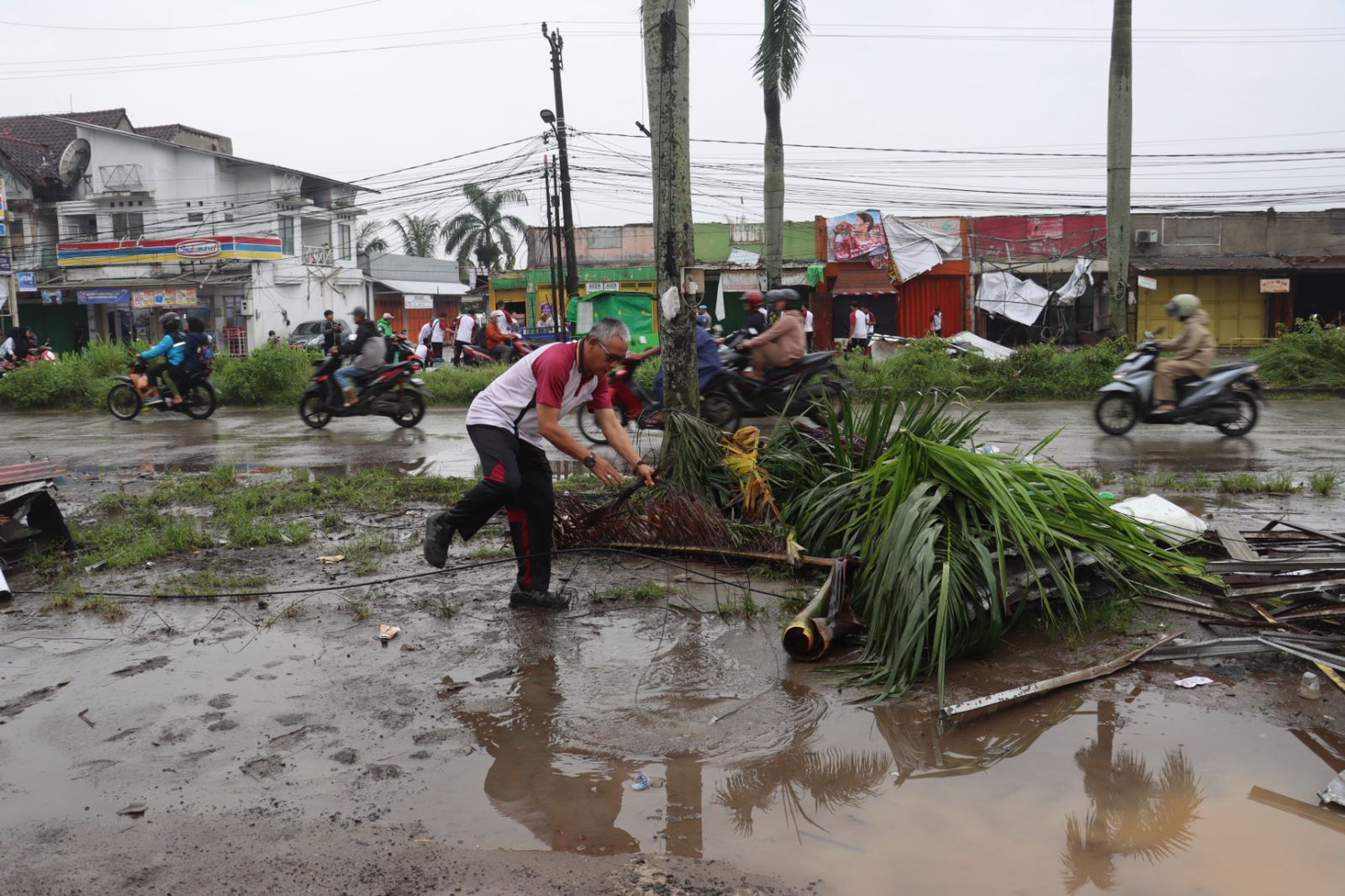 Polisi bersama warga membersihkan sisa pohon tumbang, dahan patah, serta puing atap rumah dan ruko yang berserakan akibat terjangan angin kencang.