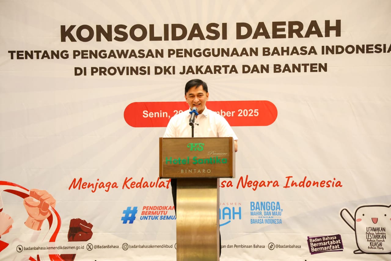 Hal itu disampaikan Dimyati saat memberikan sambutan pada acara Konsolidasi Daerah tentang Pengawasan Penggunaan Bahasa Indonesia di Provinsi DKI Jakarta dan Banten yang digelar di Hotel Santika Premiere Bintaro, Jl. Prof. Dr. Satrio No. A3, Pondok Jaya, Kecamatan Pondok Aren, Kota Tangerang Selatan, Senin (29/9/2025).